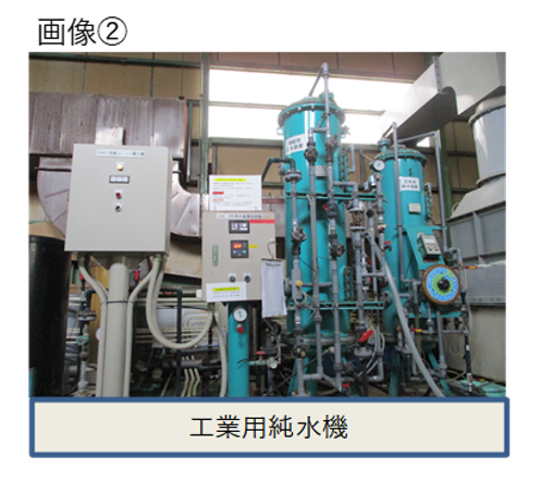 製品表面に白い乾燥跡が発生する場合、水垢(ウォーターデポジット)が考えられます。水垢は水に含まれる不純物(ミネラル分)が乾燥シミとして残る現象です。対策としては乾燥前にエアーを用いて水滴を飛ばす、若しくは拭き上げる。又、後処理最終槽に純水を使用する等が挙げられます。この純水とはカルシウム・塩素等の不純物(ミネラル分)を取り除いたもので、精製水としても市販されていますが、大量に使用する工業用の場合、純水機(※画像②)を用いて上水・工業用水を純水に変換し処理を行います。但し、純水機は定期的に高額なイオン交換樹脂のメンテナンスが必要となり製造コストの上昇にも繋がりますので、お客様の求める品質・要求事項に合わせた運用を検討する必要があります。
